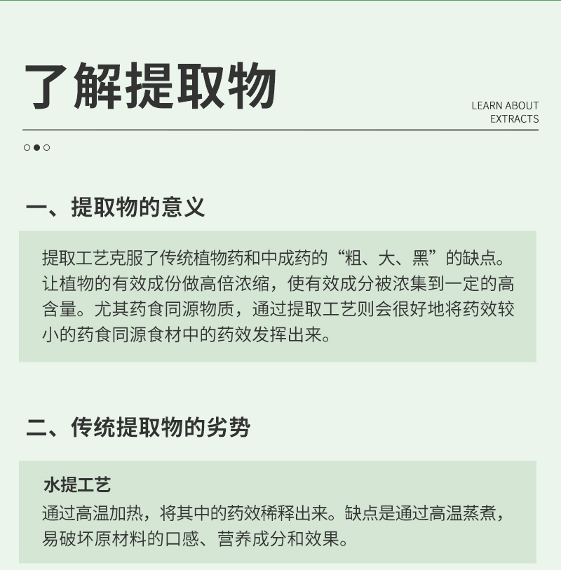 產(chǎn)品工藝優(yōu)勢(shì):古法新制,低溫萃取,保留原料‘’四性五味‘’,低溫真空濃縮,霧化噴粉,所得產(chǎn)品純度高,分子小,易吸收。國(guó)際先進(jìn)工藝,效率更高。
